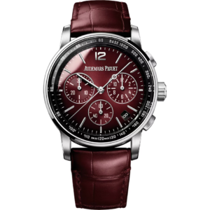 The chronograph’s 18-carat white gold case is enhanced by a smoked burgundy lacquered dial with sunburst effect and a matching alligator strap.