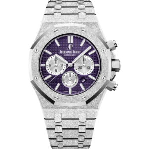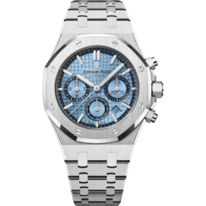Reference 26317BC.OO.1256BC.01 Royal Oak Chronograph A limited edition white gold automatic chronograph wristwatch with date and bracelet. The Royal Oak is one of the most iconic watch designs of the last 40 some years, and the Royal Oak Chronograph has since carved out a special place of its own in horological lore. This 18k white gold Royal Oak Chronograph was released in 2020 in a limited edition run of 100 pieces. It features a light-blue "Grande Tapisserie" dial, with a dark blue outer ring housed in a 38 mm case.