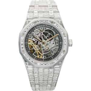 The Audemars Piguet Royal Oak Skeleton Watch, with reference number 15417BC.ZZ.1267BC.01, is a luxurious timepiece that exudes elegance and sophistication. Crafted from exquisite white gold, this unworn watch showcases a transparent dial and a mesmerizing skeletonized movement. The watch features a white gold strap and clasp, ensuring a secure and comfortable fit. With its stunning white gold bezel and automatic movement, this timepiece is a true testament to Audemars Piguet’s commitment to exceptional craftsmanship and timeless design. This 18-carat white gold timepiece is set with 436 baguette-cut diamonds, illuminating the cutting-edge openworked double balance wheel mechanism in rhodium-toned hue visible on both sides of the watch.
