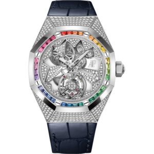 The rainbow bezel composed of baguette-cut multicoloured gemstones enhances the Royal Oak Concept’s white gold case, dial and movement components entirely set with brilliant-cut diamonds.