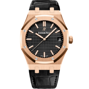 This 41 mm Royal Oak Selfwinding endowed with the collection’s new ergonomic design evolution marries stainless steel with an elegant black Grande Tapisserie dial.