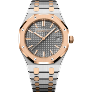 This 37 mm timepiece is endowed with a two-tone case marrying stainless steel with 18-carat pink gold and a silver-toned "Grande Tapisserie" dial. It also encompasses the latest Royal Oak design evolution and the selfwinding Calibre 5900.