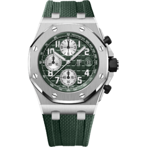 The newly designed 43 mm Royal Oak Offshore, powered by Calibre 4401, takes on grey hues with its titanium case, grey ceramic bezel, refined “Méga Tapisserie” dial and interchangeable rubber strap.