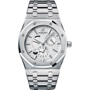 This tone-on-tone 38 mm Chronograph is endowed with the new Royal Oak design evolution. Its stainless steel case is complemented with a grey “Grande Tapisserie” dial illuminated with silver-toned counters.