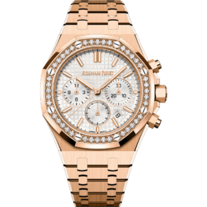 The pink gold case and bracelet of this 38 mm Chronograph are enriched with a diamond-set bezel and a silver-toned “Grande Tapisserie” dial. The new Royal Oak design evolution bestows the watch with a slenderer aesthetic.