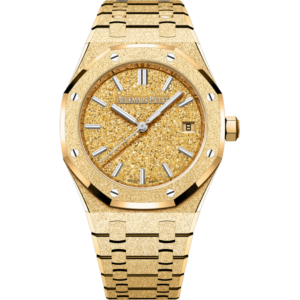 This 34 mm timepiece in 18-carat yellow gold sparkles with Frosted Gold. The dial is embellished with the Manufacture’s new embossed “Crystal Sand” finish in golden hue for a glamourous monochrome look.