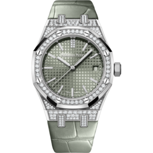 This 37 mm model benefits from the Royal Oak design evolution and the selfwinding Calibre 5900, both introduced in 2022. Its 18-carat pink gold case and bracelet are contrasted with a silver-toned “Grande Tapisserie” dial and a diamond-set bezel.