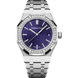 Blue dial with “Grande Tapisserie” pattern, blue counters, white gold applied hour-markers and Royal Oak hands with luminescent coating.
