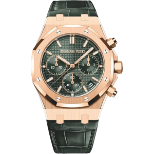 This 41 mm Selfwinding Chronograph, bestowed with the latest Royal Oak design evolution, marries 18-carat pink gold with a khaki “Grande Tapisserie” dial and a matching alligator strap.