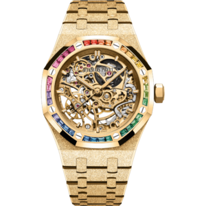 The 18-carat yellow gold case and bracelet glitter with Frosted Gold, while the rainbow bezel set with multicoloured gemstones provides a vivid contrast to the yellow gold-toned openworked movement.