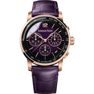 The chronograph’s 18-carat pink gold case is adorned with a sunburst smoked purple lacquered dial and a matching hand-stitched alligator strap.