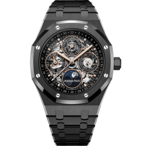 A feat of technical mastery, the Royal Oak Perpetual Calendar Openworked dresses the artistic openworked sapphire dial and the movement’s visible pink gold components in black ceramics.