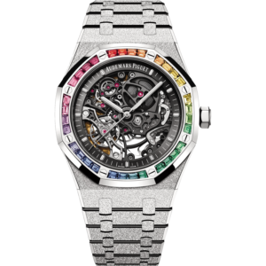 This 41 mm timepiece in shades of grey, ranging from the white Frosted gold case and bracelet to the slate grey openworked movement, is enriched with a rainbow bezel set with baguette-cut multicoloured gemstones.