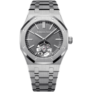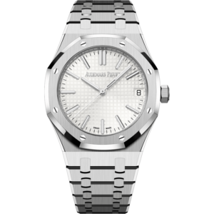 This stainless steel Royal Oak Selfwinding in 41 mm, adorned with a silver-toned Grande Tapisserie dial, presents the collection’s new ergonomic design evolution.