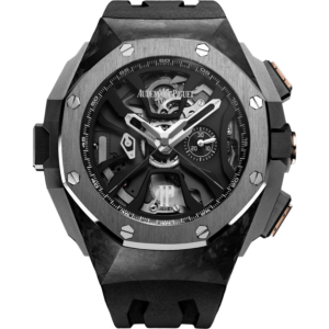 Audemars Piguet Royal Oak Concept Laptimer Michael Schumacher Limited Edition (26221FTOOD002CA01) manual wind watch, features a forged carbon case surrounding a black openworked dial on a black rubber strap with a titanium deployant buckle. Functions include hours, minutes and flyback chronograph.