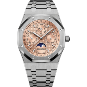 This 41 mm Selfwinding Chronograph, which is endowed with the latest Royal Oak design evolution, marries 18-carat pink gold with a silver-toned “Grande Tapisserie” dial.