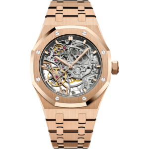 Aesthetics, precision and balance come together in the patented geometry of the Royal Oak Double Balance Wheel Openworked. The complex mechanism is visible from both sides of this pink gold watch.
