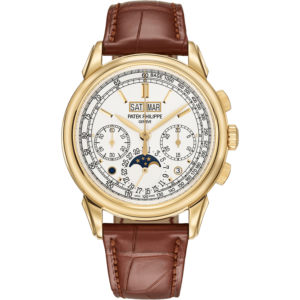 Patek Philippe Grand Complications 5270J-001 As the heir of a grand Patek Philippe classic, the Ref. 5270 Chronograph with a perpetual calendar is now available in yellow gold for the first time – an elegant outfit for this timeless watch with a concave bezel and fluted lugs. The silvery opaline dial is superbly legible. The caliber CH 29-535 PS Q movement combines traditional design with six patented innovations and an extremely slender calendar mechanism.
