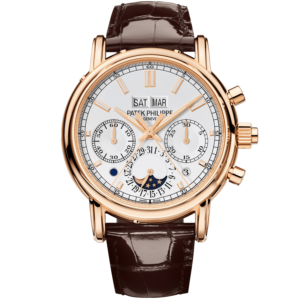 Patek Phillippe Grand Complications 5204R-001 Patek Philippe reinterprets the Reference 5204R split-seconds chronograph and perpetual calendar in a contemporary spirit by combining a rose gold case with a matching slate white dial. This rare and refined nuance contributes to renewing the style of this much sought-after Grand Complication. The transparent sapphire caseback offers a magnificent immersion into the heart of caliber CHR 29-535 PS Q, with its traditional architecture (manual winding, two column wheels, horizontal clutch) combined with seven patented innovations and highly refined manual finishing.