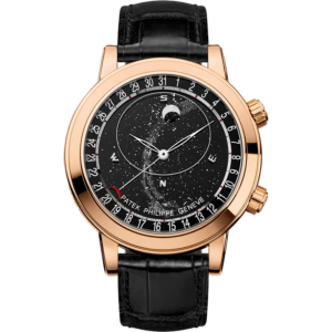 Patek Philippe Grand Complications Celestial Moon Age 6102R-001 Highlighting Patek Philippe’s great tradition of astronomical watches, the Celestial devotes its dial to a rotating chart of the heavenly bodies. At any time, its owner may admire the exact configuration of the nocturnal sky in the northern hemisphere, with the apparent movement of the stars and the phases and orbit of the moon. Two skeletonized hands point to the hours and minutes of mean solar time. An Ellipse, deposited on the underside of the sapphire glass, frames the portion of the sky visible from Geneva and all other cities located at the same latitude.