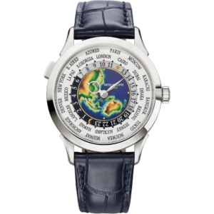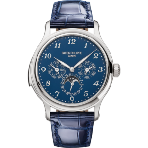 Patek Philippe Grand Complications Minute Repeater Perpetual Calendar 5374G-001 The Reference 5374 Grand Complication with minute repeater and perpetual calendar combines technical excellence and elegance in a new white gold version with a Grand Feu blue enamel dial featuring a glossy finish. The case shape is distinguished by its subtle interplay of curves and its concave bezel. The minute repeater with its “cathedral" gongs wrapping almost twice around the movement is distinguished by its rich, deep sound.
