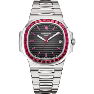 Patek Philippe Nautilus Platinum Rubies 5711/112P-001 The present model reference 5711/112P-001 is a very special edition of a handful of pieces only, made for VIP customers and not available on the public catalogue. A very similar version with a white dial was first released around 2015, made in even smaller quantities. This second version is fitted with a very elegant and new anthracite/black dial. What truly sets the present watch apart is that it is rendered in platinum, with a bezel set with 32 baguette rubies (4 ct.) and 12 rubies on the hour markers. Further down, into the side of the bezel, you can find a small flawless diamond, a discreet sign to mark the Patek Philippe watches made in the most noble metal.