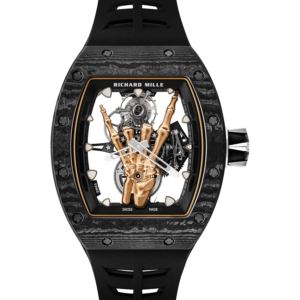 Richard Mille RM 66 Manual Winding Flying Tourbillon Limited Edition Limited to 50 pieces On the exterior, the RM 66 Flying Tourbillon references the brand’s other models with its multi-component tonneau-shaped silhouette. It is 42.7mm wide with a length of 49.94mm from lug to lug and sports a thickness of 16.15mm. Both the bezel and caseback are made from black Carbon TPT, which has a “damascene appearance” that makes the surface look almost oxidized. Between those front and back layers is a titanium caseband with 5N red gold polished inserts. Kept together with 20 titanium spline screws, the abrasion-resistant case is also water resistant to 50 meters. In true Richard Mille fashion, the majority of the dial is skeletonized, with the open-worked design creating space for unique adornment. The centerpiece of the watch is a red gold skeleton hand with the index and pinky fingers raised, forming the iconic rock and roll “ devil horns” hand gesture in the center of the dial. Richard Mille delicately hides the movement components behind the hand sculpture, opting for subdued indices so as not to compete with the design. The watch also features an exhibition cashback, providing a complete view of the sculptural hand, which appears to almost grasp the movement on the reverse.