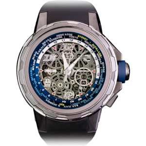 Richard Mille RM 63-02 Automatic Winding Worldtimer Limited Edition 47mm Richard Mille first unveiled the RM 58-01 Tourbillon World Timer at the 2013 Salon International de la Haute Horlogerie. Designed for frequent travelers and others alike, this timepiece made a strong impression thanks to its remarkably easy to use multi-time-zone mechanism. When designing the RM 58-01, Richard Mille’s goal was to simplify the setting of this complication as much as possible, notably by removing the need for a pusher in activating the time zone function. The RM 63-02 World Timer repeated this exercise, incorporating the World Timer function at the heart of an automatic in-house movement.