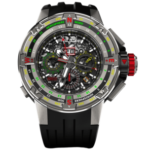 Richard Mille RM 60-01 Automatic Winding Flyback Chronograph Regatta 50mm With the RM 60-01 Regatta Flyback Chronograph, Richard Mille presented his first technical watch for navigating the seven seas. Powered by the grade 5 titanium RMAC2 calibre with its 55 hours of power reserve, variable inertia balance, complete flyback chronograph functions, annual calendar with oversize date and UTC function, the RM 60-01 adds navigational capabilities thanks to its special rotating bezel with indications of the four cardinal points combined with a graduated 360° and a 24-hour scale disk.