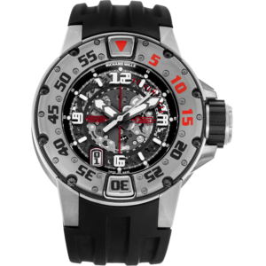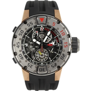 Richard Mille RM 025 AJ Ti Manual Winding Tourbillon Chronograph 50mm The Richard Mille RM 025 AJ Ti Manual Winding Tourbillon Chronograph is a highly advanced diver’s watch that blends complex horological features with robust materials. It features a 50.7mm titanium case and is water-resistant up to 300 meters, making it a reliable choice for underwater activities. The watch includes a manual-winding movement with a tourbillon and chronograph complication, powered by the RM025 caliber, which has a power reserve of approximately 50 hours. The RM 025’s dial is skeletonized, allowing a clear view of the intricate movement, and the case design incorporates grade 5 titanium and red gold elements, ensuring durability while maintaining a lightweight feel. The movement's unique features include a torque indicator and a power reserve display, providing valuable insights into the watch’s performance. The chronograph is operated by a monopusher located at 8 o'clock, and the watch also has a rotating bezel that can only be adjusted when the pushers at 12 and 6 o'clock are depressed. This exceptional timepiece is known for its avant-garde design and technical prowess, making it a true statement piece in the realm of high-end luxury watches​.