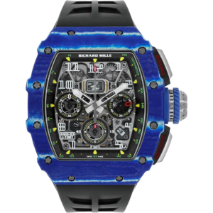 Richard Mille RM 11-03 Jean Todt 50th Anniversary Limited Edition Limited to 150 pieces. Jean Todt was one of the first and still one of the most prominent people to wear Richard Mille. In 2018, to celebrate 50 years active in the world of motorsports RM released 3 limited editions to Honour the legend, The RM011 03, RM056 and RM050. Only 150 pieces were made of the RM11-03. The unique case is made of blue Quartz TPT using 600 layers of silica, each only 45 microns thick, are stacked and impregnated with a blue resin, before being heated to 120 °C. The result is an extremely light and resistant case, resembling in many ways the body of a high-performance race car.