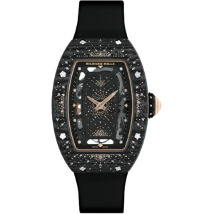 Richard Mille RM 07-01 Intergalactic Dark Night The Richard Mille RM 07-01 Intergalactic "Dark Night" is a part of the Intergalactic collection, designed to evoke the mystery and beauty of the cosmos. This luxurious timepiece features a Carbon TPT® case and a diamond-set bezel accented by red gold prongs. The watch is powered by the CRMA2 automatic winding movement, known for its robustness and precise timekeeping. The case dimensions are 31.4mm x 45.66mm, with an open caseback and a black rubber strap for a refined yet sporty look. The "Dark Night" variant stands out with its use of polished 5N red gold for the prongs and crown, contrasting against the matte black Carbon TPT® and creating a stunning visual effect that symbolizes constellations in the night sky. The watch offers a power reserve of approximately 50 hours and is water-resistant up to 50 meters. The design aims to capture the allure of an "explosion of stars" as envisioned by Richard Mille's Creative and Development Director, Cécile Guenat​.