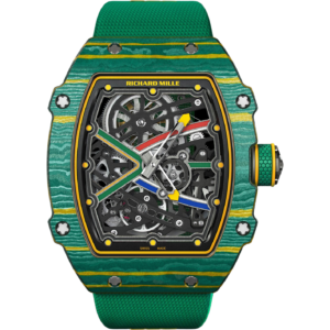 RICHARD MILLE RM 67-02 VAN NIEKERK Starting with the RM 67-01, whose lightness, thinness and ergonomics made it a perfect candidate, we reworked its lines to highlight its hidden athletic qualities. The definition of the bezels and case with four extensions, in addition to being a hallmark of the brand’s sports watches, contributes to the reinforcement the case structure. The RM 67-02 weighs a mere of 32 grams, thanks to the combination of TPT® composite materials, grade 5 titanium and the elastic wristband, the lightest strap ever created by the brand. Thin, lightweight, coloured, elegant and athletic, the RM 67-02 is the watch for any situation. Breaking with precedent, Richard Mille designed this model so that it can be adapted to various sporting disciplines. This is why several of the brand’s partners have had developed an RM 67-02 in the colours of their respective countries, so as to test the abilities of this automatic calibre in a range of settings. Skeletonised automatic-winding movement with hours and minutes.