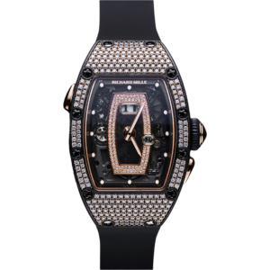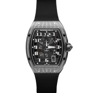 Richard Mille RM 67-01 Diamond The Richard Mille RM 67-01 is a testament to the brand's mastery of ultra-thin watchmaking. Featuring a lightweight titanium case and a gem-set bezel, this timepiece combines durability with exquisite elegance. Its transparent dial, adorned with Arabic numerals, offers a glimpse into the intricate automatic movement within. Paired with a black rubber strap for comfort and a contemporary look, the RM 67-01 is both a stylish accessory and a reliable timekeeper, water-resistant to 50 meters.