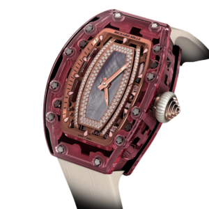 Richard Mille RM 07-01 RG-TPZ Red Lip Automatic Winding The Richard Mille RM 07-01 RG-TPZ "Red Lip" Automatic Winding is a sophisticated women's watch, combining luxurious design elements with high-performance functionality. The watch is equipped with the skeletonized CRMA2 automatic movement, which features hours, minutes, and a variable-geometry rotor. This rotor allows the watch to adapt its winding speed based on the wearer's activity level, making it both practical and efficient. This model is distinguished by its blend of cutting-edge materials and refined aesthetics, making it a standout piece within the Richard Mille collection​.
