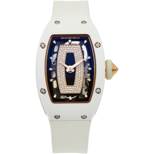 Richard Mille RM 07-02 Automatic Winding Sapphire The Richard Mille RM 07-02 Automatic Winding Sapphire is a high-end women's watch that exemplifies elegance and sophistication through its unique use of colored sapphire and gem-setting technology. It features a skeletonized automatic-winding movement (CRMA5 caliber) encased in a sapphire case with prongs made of red or white gold, set with diamonds. This model is notable for its delicate gem-setting process, which uses laser technology to create precise openings for diamonds, making each watch a true masterpiece. Due to the difficulty of working with sapphire, these watches are extremely limited and highly sought after.