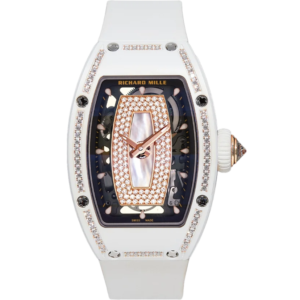 Richard Mille RM 07-01 RG ATZ MOP Automatic Winding The Richard Mille RM 07-01 RG ATZ MOP is an elegant ladies' watch featuring a combination of white ATZ ceramic and 5N red gold, paired with a Mother of Pearl (MOP) dial set with diamonds. It houses the CRMA2 automatic movement, which is renowned for its skeletonized design and a variable-geometry rotor that adapts its winding speed based on the wearer’s activity level. The case dimensions are 45.66mm x 31.4mm, providing a refined and sophisticated appearance. The watch is completed with a white rubber strap and offers water resistance up to 50 meters, making it suitable for both formal and daily wear