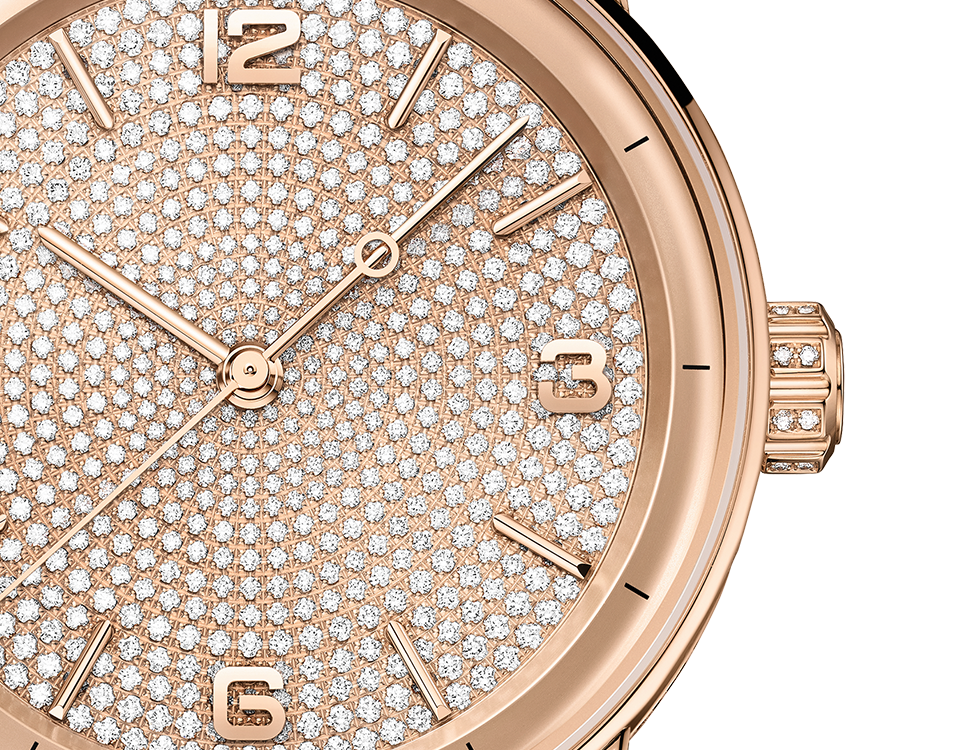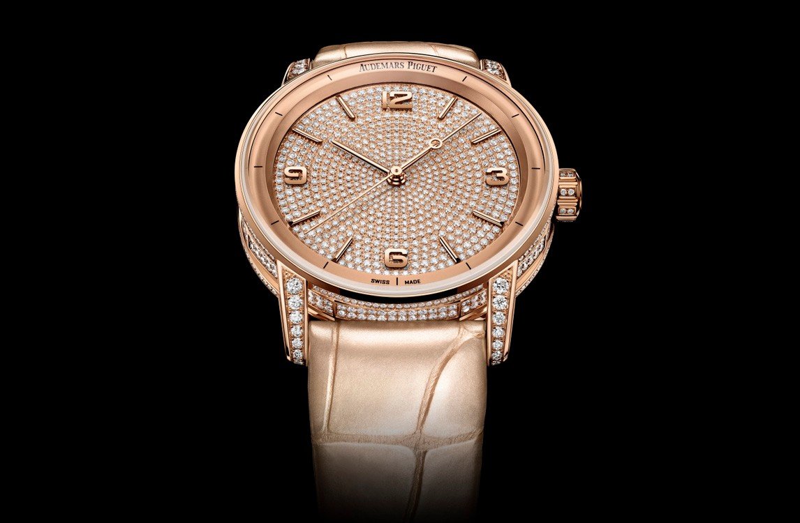For the first time, the 18-carat pink gold case and dial of the Code 11.59 by Audemars Piguet Selfwinding shimmer with brilliant-cut diamonds. The timepiece further adorns a refined pearly beige alligator strap.