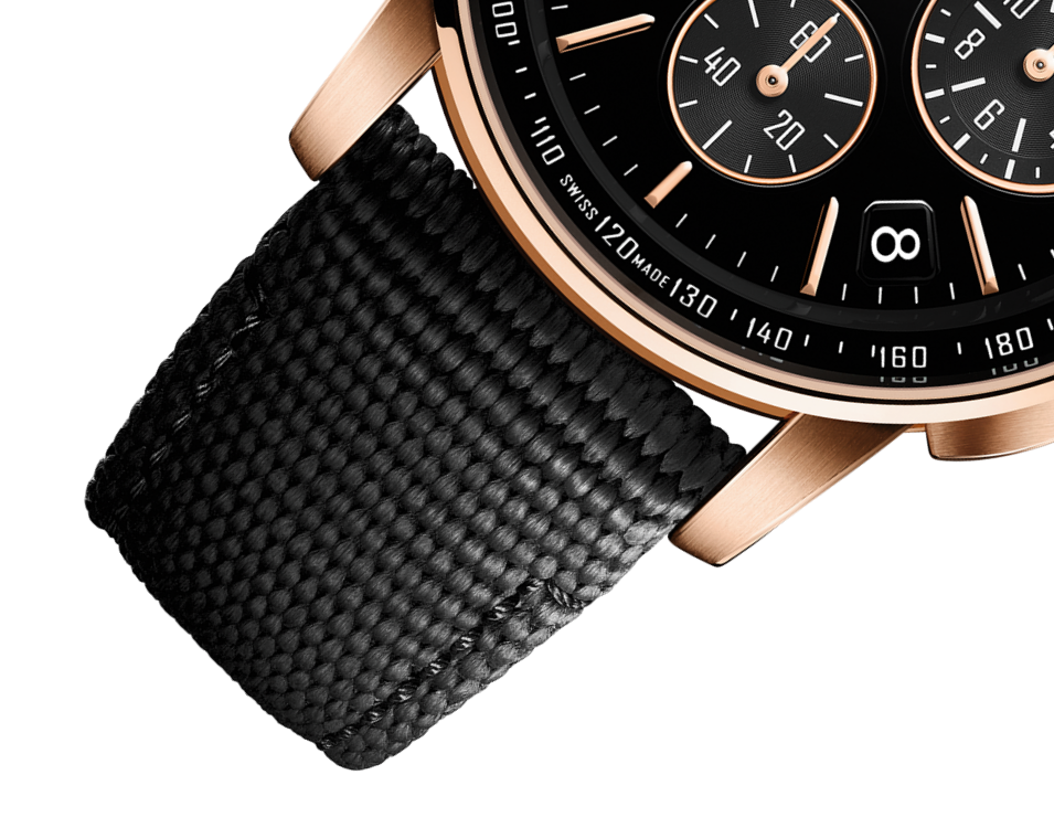 The selfwinding chronograph’s black lacquered dial offers a perfect mirror finish. The 18-carat pink gold case echoes the curved gold indexes and singular numeral at 12 o’clock.