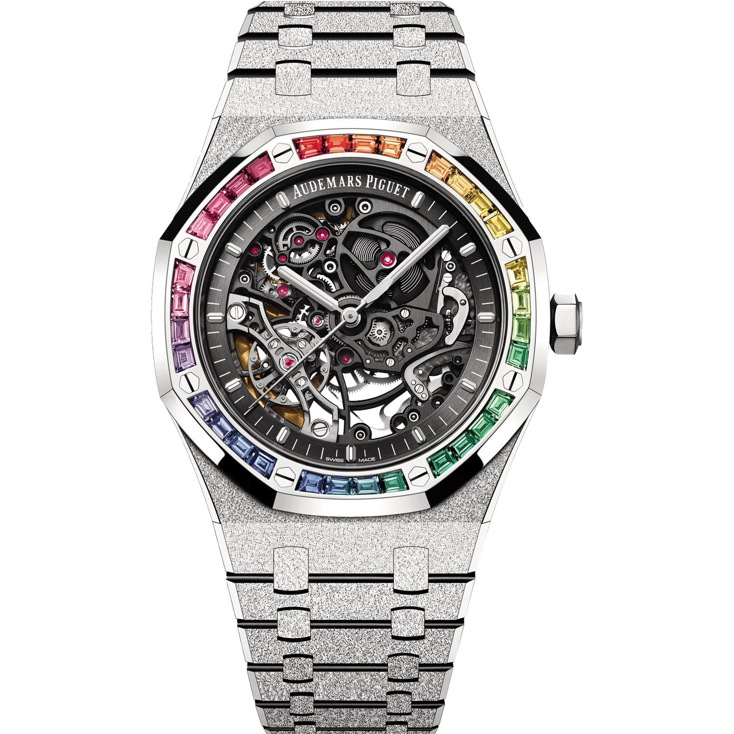This 41 mm timepiece in shades of grey, ranging from the white Frosted gold case and bracelet to the slate grey openworked movement, is enriched with a rainbow bezel set with baguette-cut multicoloured gemstones.