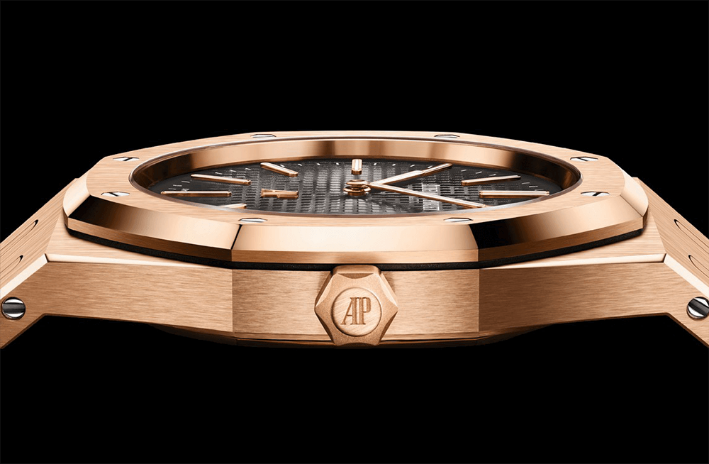 This “Jumbo” model marries the Royal Oak’s original aesthetic codes with a pink gold body and smoked slate grey “Petite Tapisserie” dial. It houses the new selfwinding movement, Calibre 7121, and is fitted with the “50-years” oscillating weight crafted in 22-carat pink gold.