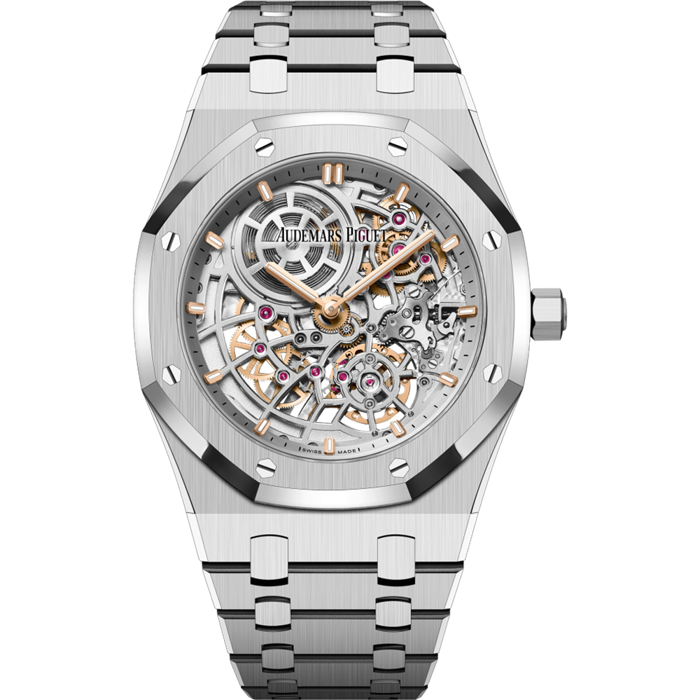 Openworking makes its come back in the Royal Oak collection with a dedicated movement, Calibre 7124. The rhodium-toned mainplate and bridges seamlessly echo the stainless steel case and bracelet. The matching “50-years” gold oscillating weight is visible through the sapphire caseback.