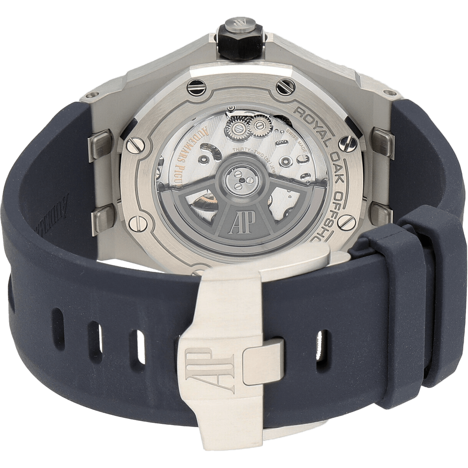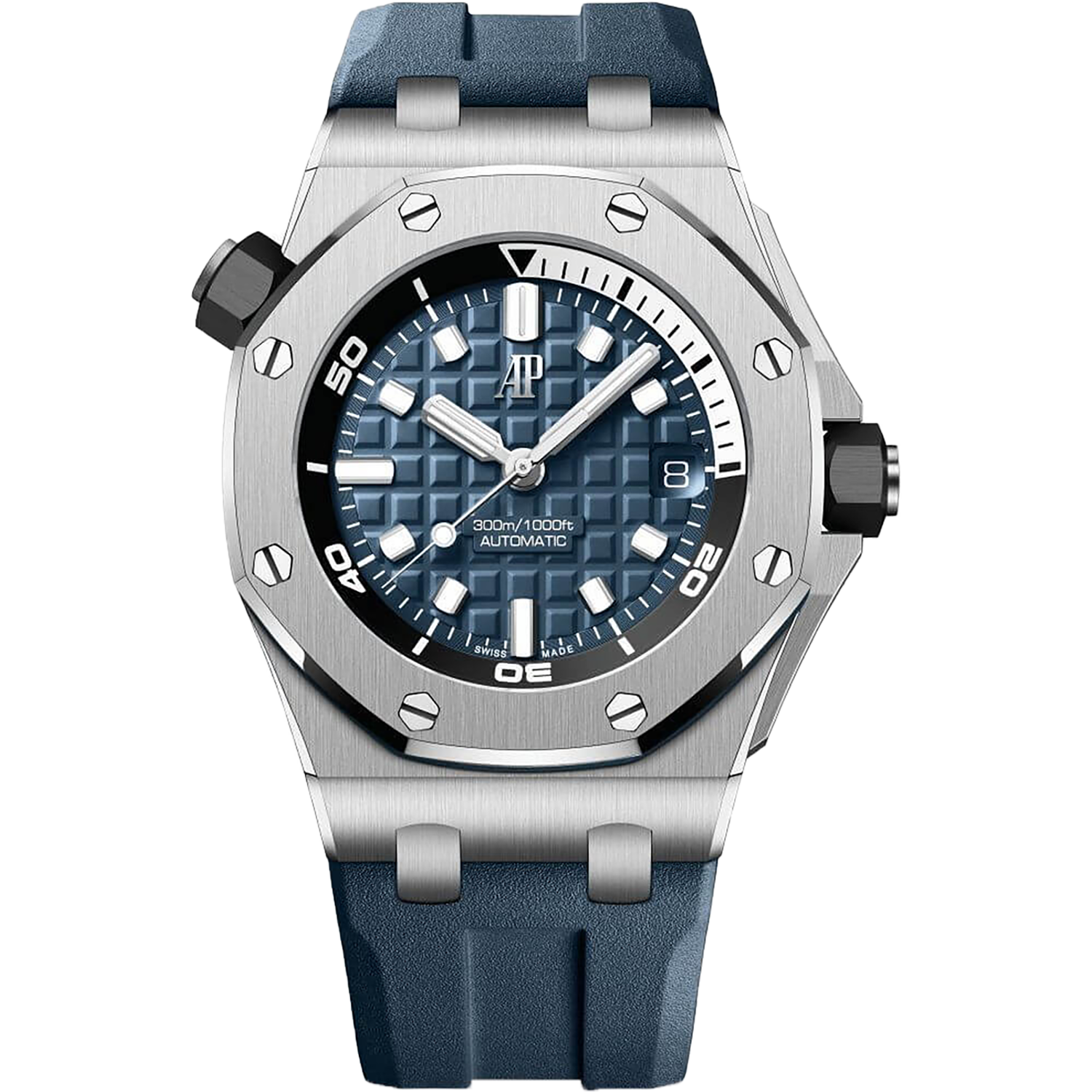 The Audemars Piguet Royal Oak Offshore (ref. AP-15720ST.OO.A027CA.01) features an automatic movement; blue dial; sapphire-crystal, transparent case back; and 42mm, stainless steel case on a rubber strap with a stainless steel buckle.