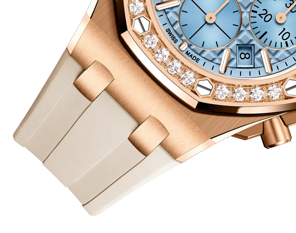 Combining a light blue “Lady Tapisserie” dial with brilliant-cut diamonds and a pink gold case, this new design brings a touch of elegance and refinement to the sporty Royal Oak Offshore Chronograph.