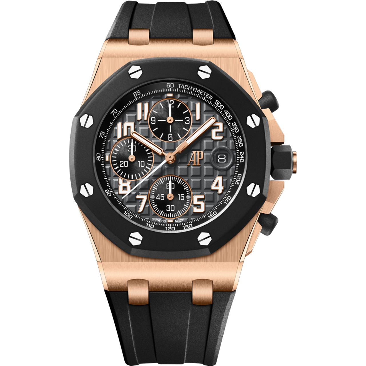 The new 42 mm Royal Oak Offshore iteration contrasts an 18-carat pink gold case with a black rubber bezel, a black “Méga Tapisserie” dial and a black interchangeable rubber strap for a sporty and elegant look.