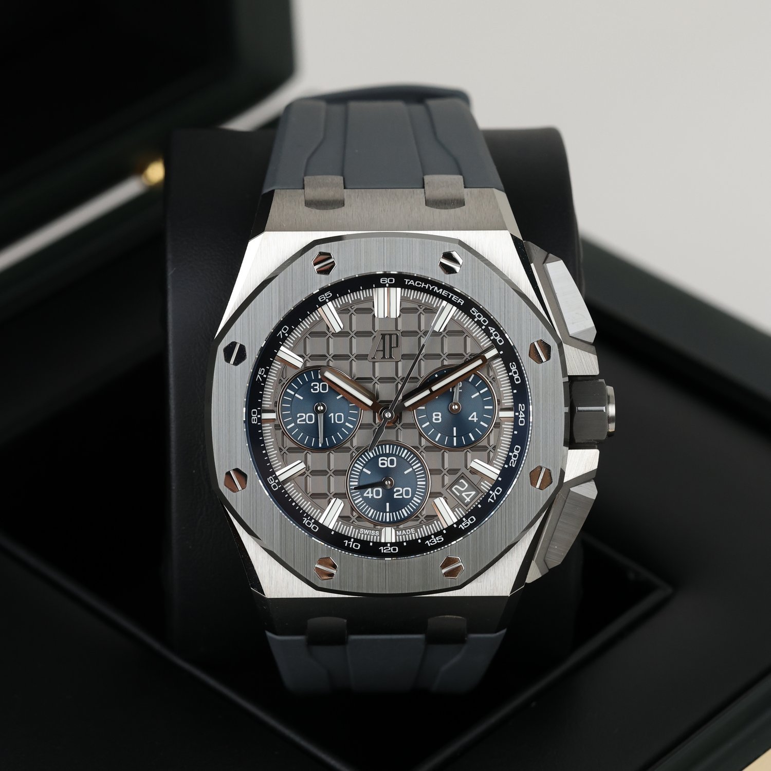 The newly designed 43 mm Royal Oak Offshore, powered by Calibre 4401, takes on grey hues with its titanium case, grey ceramic bezel, refined “Méga Tapisserie” dial and interchangeable rubber strap.