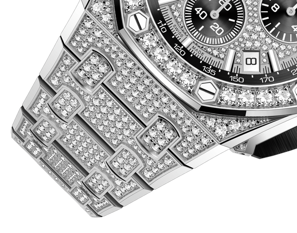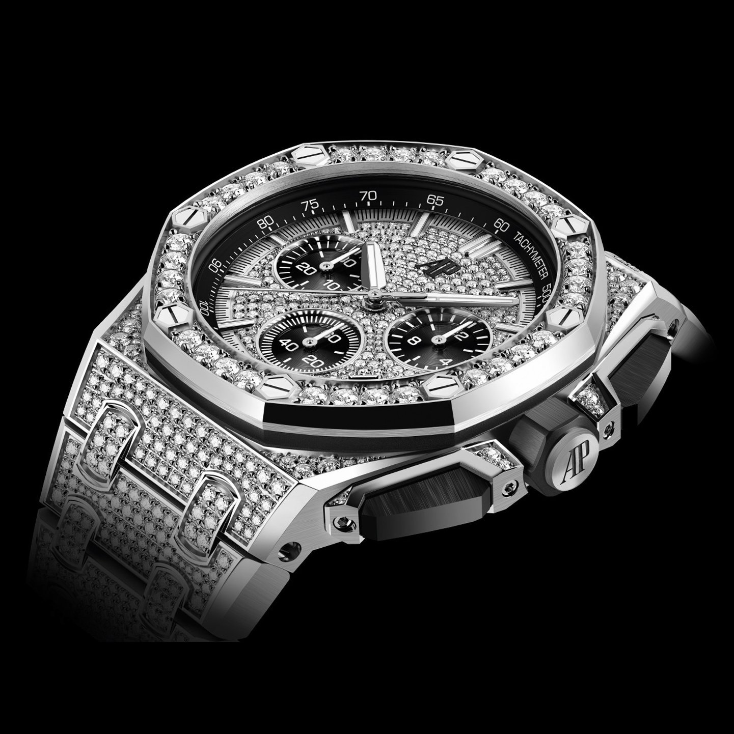 This white gold 43 mm Royal Oak Offshore is fully paved with brilliant-cut diamonds and contrasted with black accents. It is also fitted with an interchangeable bracelet entirely set with diamonds.