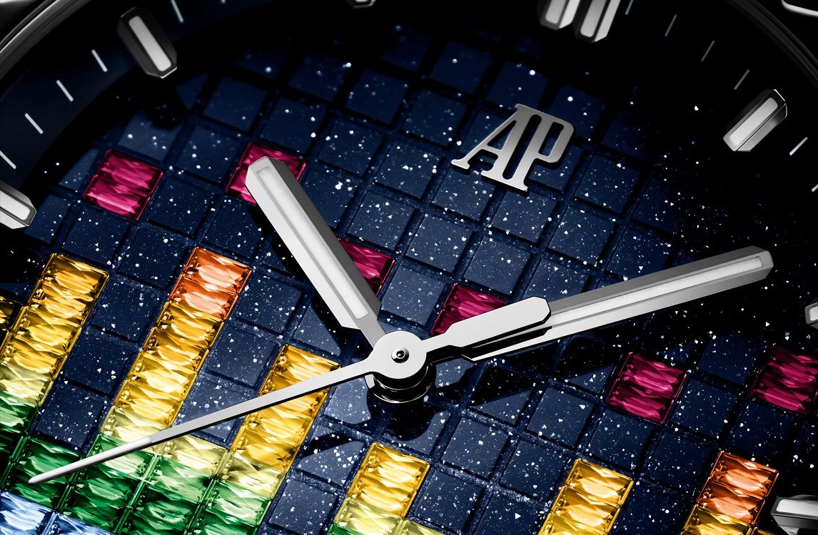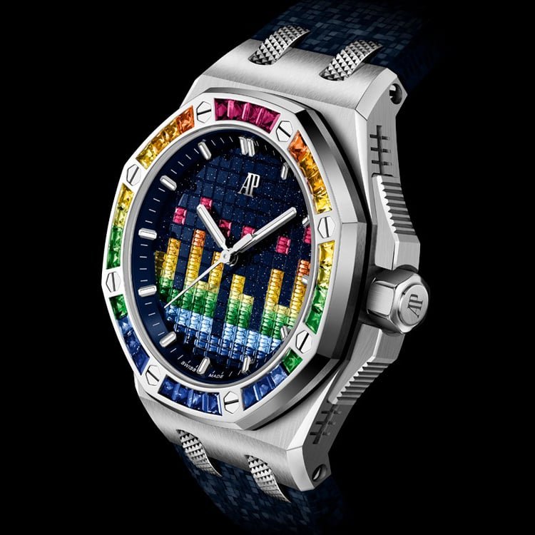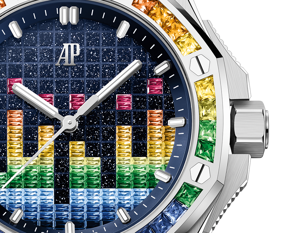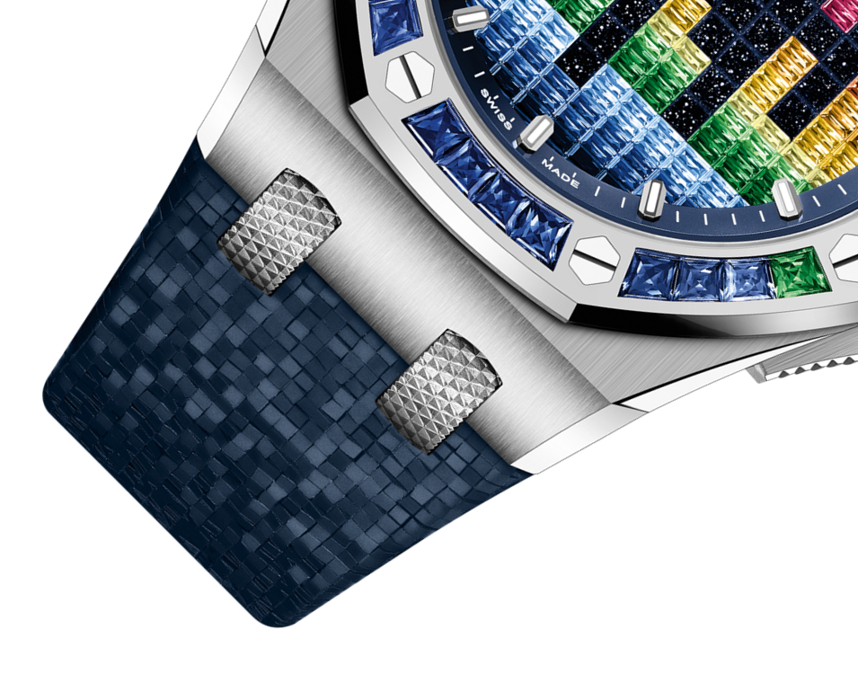 This 37 mm white gold Royal Oak Offshore Selfwinding blends avant-garde gemsetting with a design inspired by music. The pioneering harmony-cut coloured gemstones adorning the blue aventurine dial evoke a VU meter, while echoing the gemset bezel. The blue textured interchangeable rubber strap adds a refined touch.