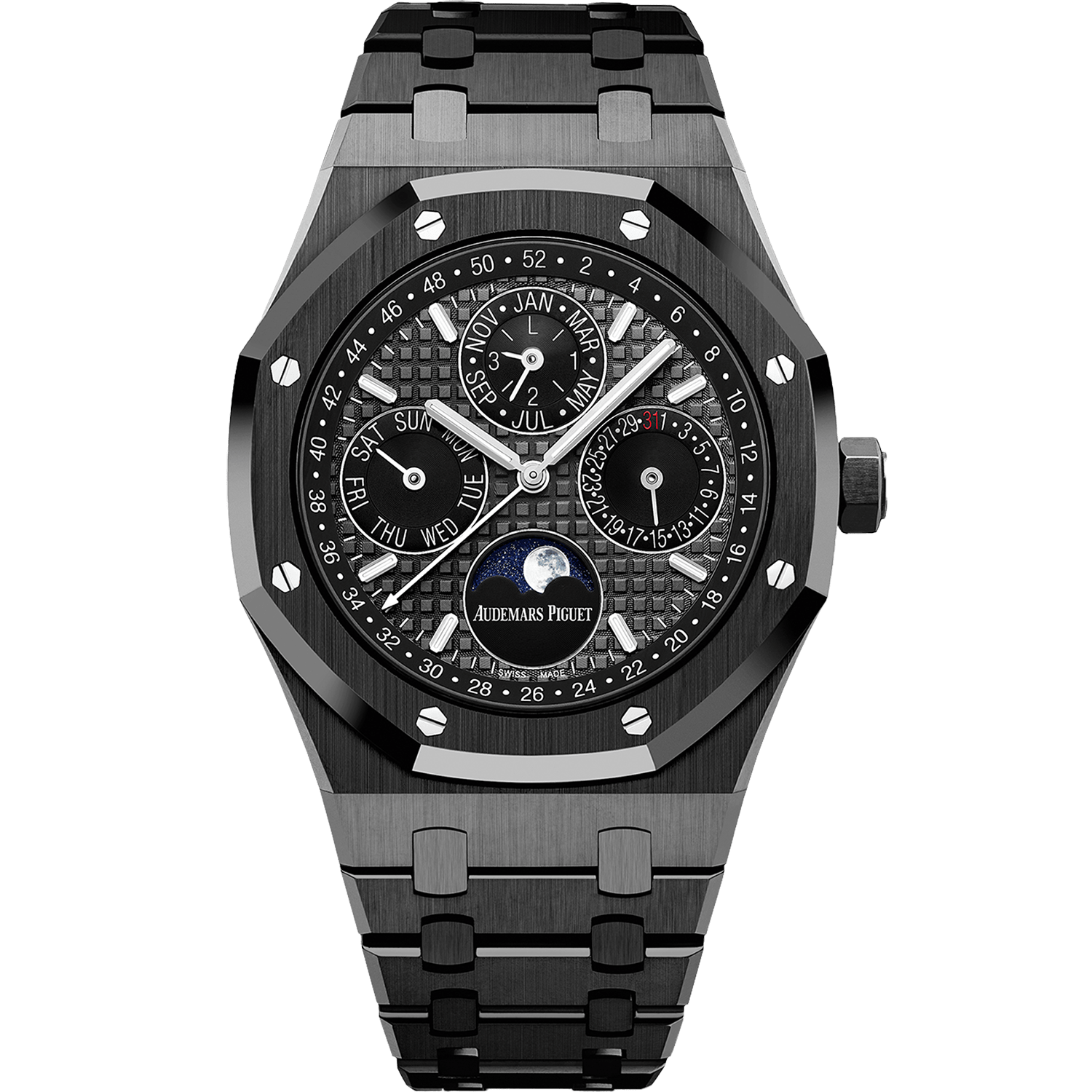 Crafted in hand-finished black ceramic, this Royal Oak Perpetual Calendar features day, date, month, astronomical moon, and week of the year. The leap year indication — pioneered by Audemars Piguet in 1955 — is also featured on the “Grande Tapisserie” decorated dial.