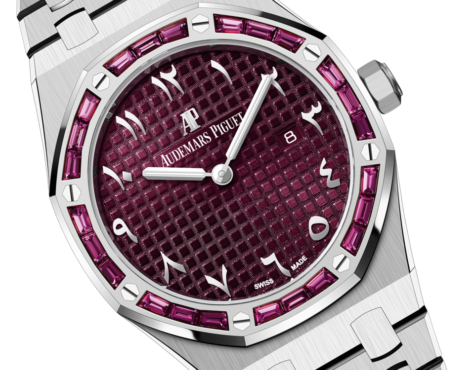 A circlet of baguette-cut burgundy garnets frame a grande tapisserie dial and sit in contrast with the 18-carat white gold case.